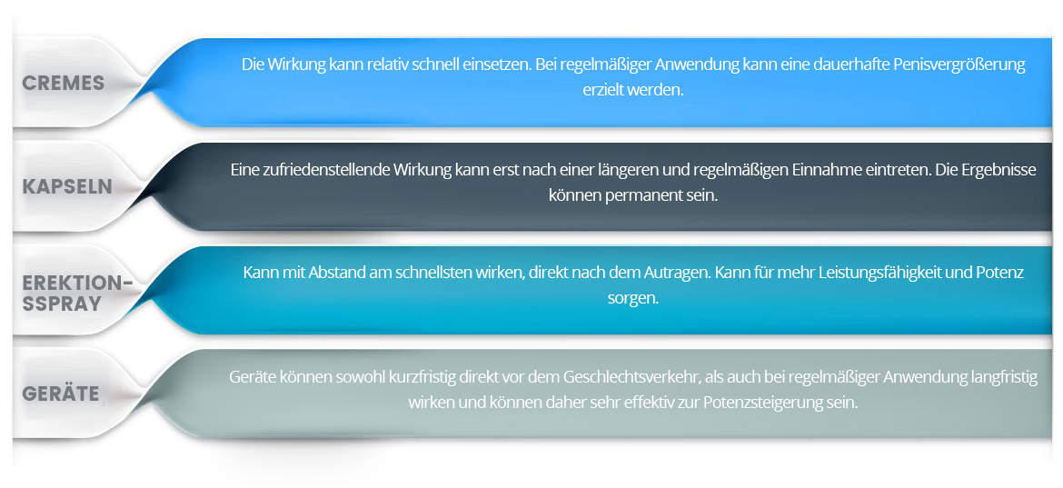 Die Wirkung von den verschiedenen Mitteln zur Beeinflussung der Manneskraft können unterschiedlich schnell eintreten. Auch deren Wirkung und Dauer kann von Person zu Person variieren. Erektionssprays und Öle können als Schnellstarter unter den natürlichen Mitteln gesehen werden, da sie ihre Wirkung bereits nach einigen Minuten entfalten können. Auch natürliche Cremes können schon kurz nach der Anwendung ihre Wirkung entfalten, da die Inhaltsstoffe eine Gefäßerweiterung im Penis unterstützen können. Häufig wird allerdings ein täglicher Gebrauch empfohlen, um so das bestmögliche Ergebnis erzielen zu können. Eine Penispumpe kann ebenfalls nach wenigen Minuten hilfreich sein, da der Blutfluss im Glied in kürzester Zeit enorm gefördert werden kann. Die meisten Kapseln müssen über einen längeren Zeitraum täglich eingenommen werden um eine zufriedenstellende Wirkung erzielen zu können. Verschwindet die Erektion direkt nach der Anwendung, so empfiehlt sich eine zusätzliche Verwendung eines Penisrings – der den Blutablauf verhindern kann. Es zeigt sich also eine unterschiedliche Dauer und Art der Anwendung.